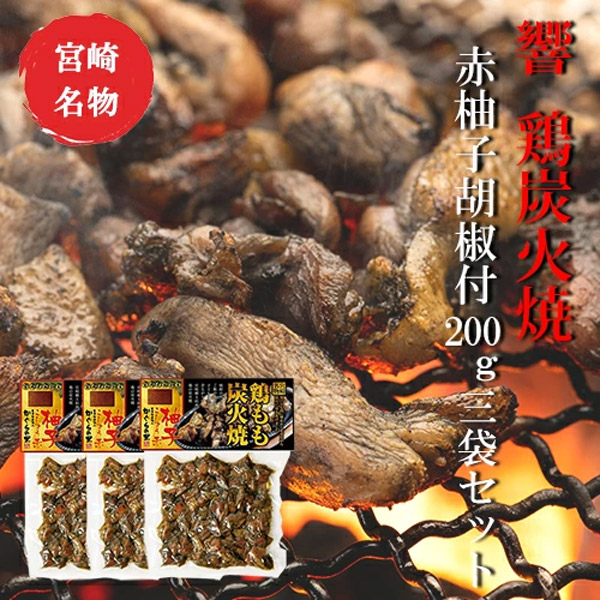 響 鶏もも炭火焼 赤柚子胡椒付200g×3袋セット【美味しい】【お歳暮】【つまみ】宮崎 人気 鶏炭火焼 ネコポス送料無料