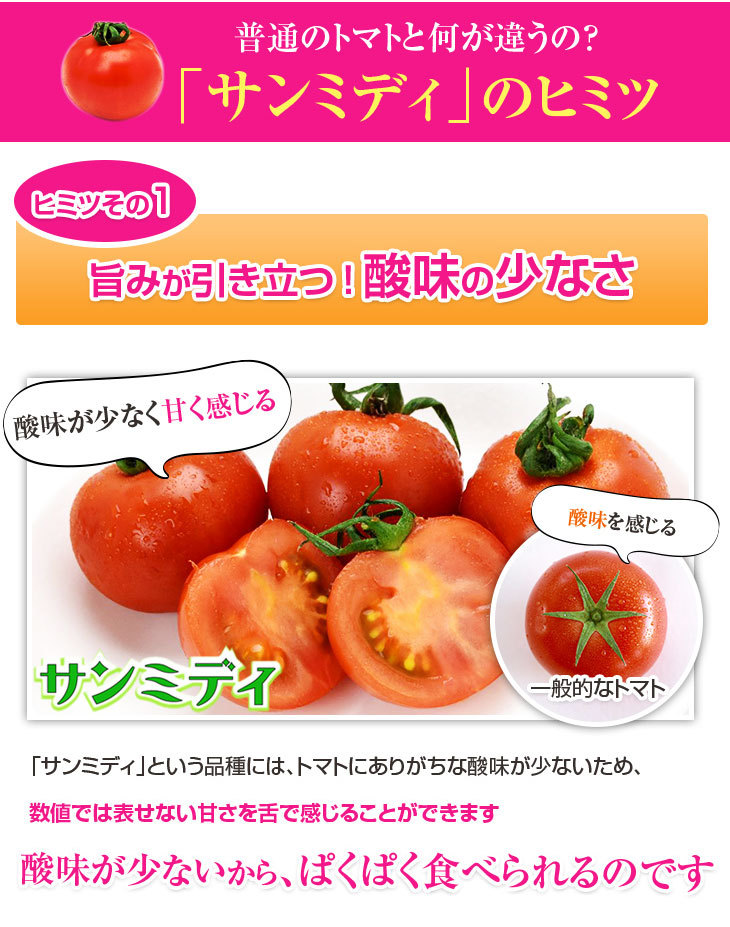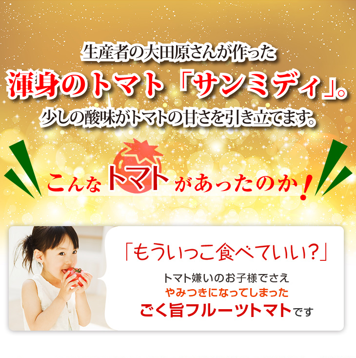 内容 完熟 トマト 「サンミディ」中玉サイズ 1kg前後(パック詰め)