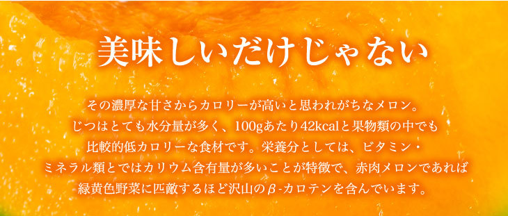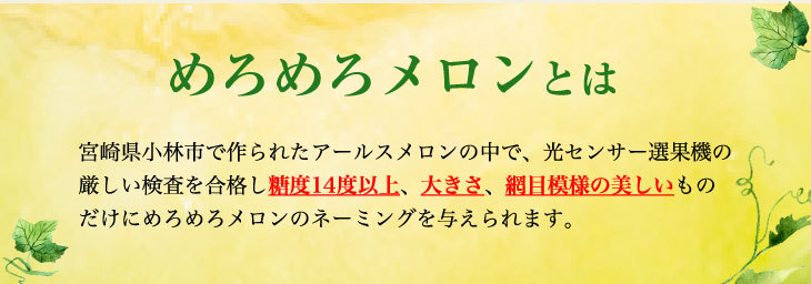 商品説明 糖度14度以上。光センサーで甘さを測り、大きさと網目の美しさにもこだわって作られた、厳しい品質検査をクリアした最高級のメロンです。1本の苗に1個だけの実を大切に育てました。