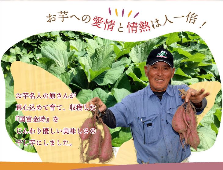 原材料はお芋だけなのに、こんなに甘い!土からこだわった美味しいお芋、国富金時から生まれた和スイーツ。そのままでも充分に美味しい、蜜がたっぷり染み出す蜜芋と、やわらかくしっとりとした優しい甘さの干し芋をお楽しみください。
