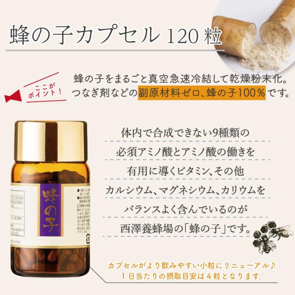 【西澤養蜂場】蜂の子カプセル(120粒) 蜂の子をまるごと真空急速冷結して乾燥粉末化。つなぎ剤などの副原材料ゼロ!