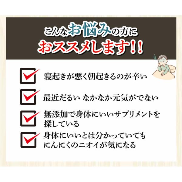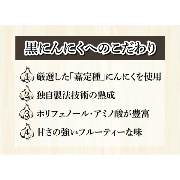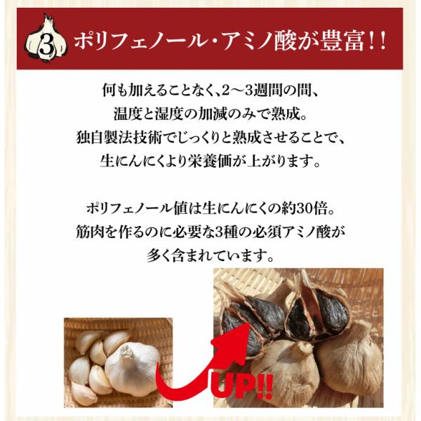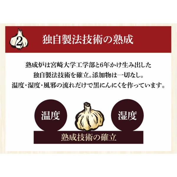 化学調味料など一切使用せず、宮崎県の情熱溢れる生産農家が一生懸命作ったにんにくを 特殊な製法で黒にんにくに進化させました。 生にんにく特有の嫌な臭いはほとんど無く、 体臭からの戻り臭もありませんので安心して1日1片を目安にお召し上がりください。